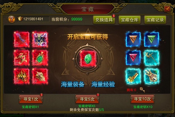 宝藏系统通过探宝有机会获得各职业的极品转生装备、高级装备及大量经验丹等珍稀道具。使用经验丹后可获得大量经验,助您加快升级速度。
