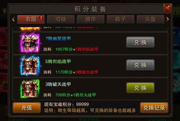 使用当前装备及一定积分,可在积分兑换处兑换更高一级的神兵!