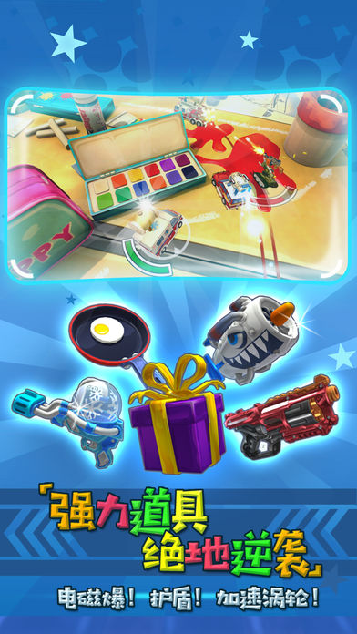 强力道具,绝地逆袭,电磁爆、护盾、加速漩涡助您一臂之力。