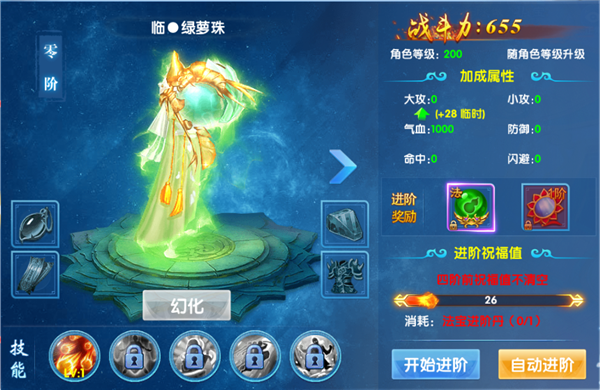 消耗法宝进阶丹可对法宝进行进阶操作,法宝进阶可显著增强法宝属性。若消耗了进阶丹而进阶失败,祝福值将自动累积,祝福值越高,下一次进阶的成功率亦越高。每次进阶成功后,都会自动发放进阶道具奖励。进阶失败后,法宝会获得一定的临时属性,其属性值依据祝福值高低而异。进阶成功后,临时属性将被进阶属性所取代。