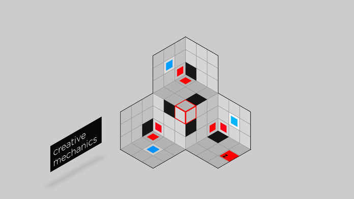 《puzzlement》游戏以横版界面呈现,属于类型,场景视图由方块几何图形交织而成,解谜的方块散布于各个区域之中,玩家必须关注那些红色方块区域,结合蓝色与黑色方块的存在,方能破解谜题。