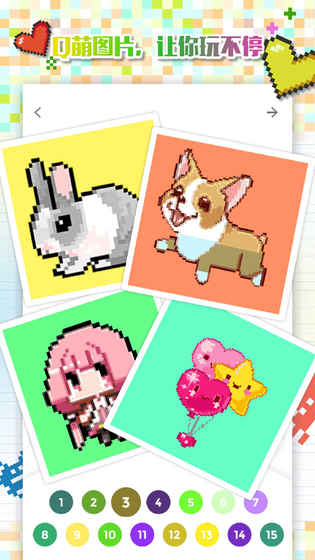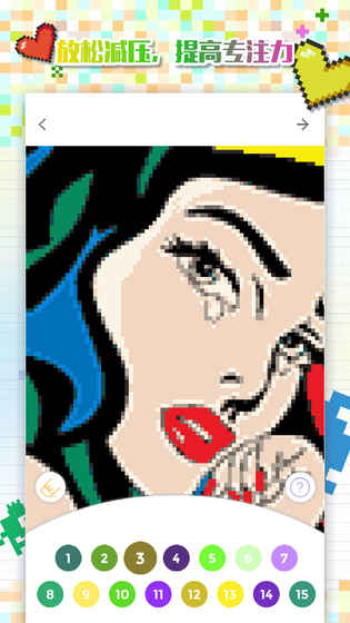 格子画更似一本像素涂色书,犹如一座像素工厂,为用户不断呈现新的像素作品。每一幅像素画均由一个个带数字的方块组成,依据数字选择颜色,轻松在方块上涂上色彩,便可完成图案。,便是数字填色、方块添彩或像素涂色。