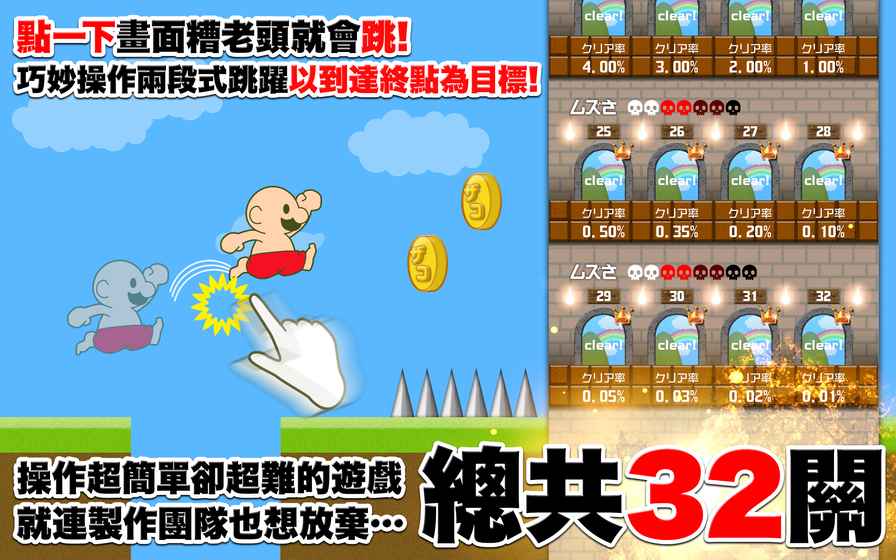 《大叔加油好吗》是一款备受欢迎的敏捷类跳跃游戏。简洁的操作配合趣味盎然的玩法设计,使您轻松上手,同时又让您难以自拔,超高难度的关卡设置,将带给您千变万化的挑战与死亡体验。