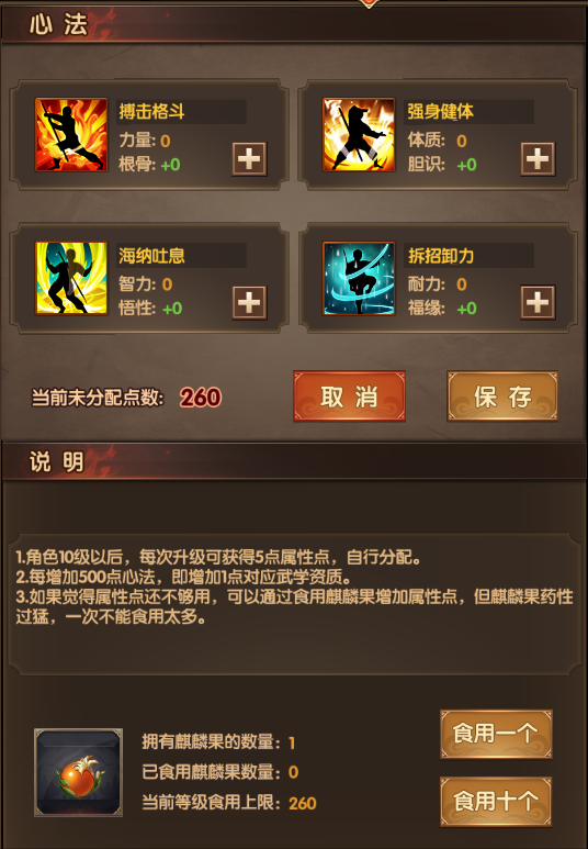 小编认为,各位大侠每级都可以根据自身需求分配点数,逐步提升自身的战力与资质。如果在商店中刷新到麒麟果道具,建议大家购买,因其为永久提升属性的丹药。但请注意,麒麟果一次不可食用过多,务必留意食用上限。