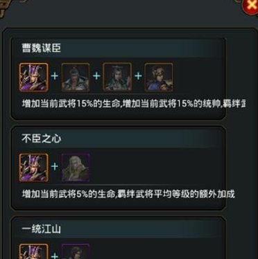 当玩家达成羁绊条件后,羁绊栏中的图标将会亮起(注:羁绊提升的属性值并不会直接显示在武将的属性栏中,而是直接在战斗中增强)。
