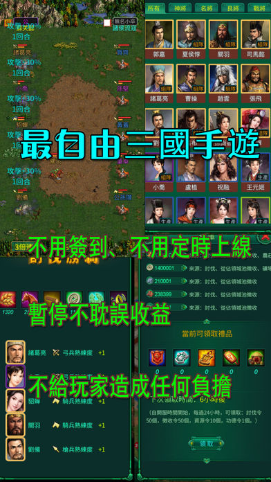 这是一个减压、放松、养生的三国手机网游。无须投入过多时间,远离日常繁琐的任务,不必强迫自己每日登录。随心所欲,想玩时便可畅游,不想玩亦无妨,即使长时间未上线,游戏收益依然如故。此游戏宛如一位温柔体贴的女子,需她时,她便悄然相伴,不需时,她绝不会打扰您。更为重要的是,她的美丽动人,能满足您的一切期许。
