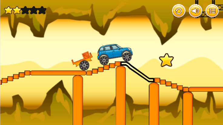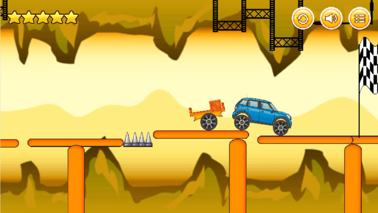 吉普车大的玩法颇为简便,玩家将操控吉普车向前驶去,后方拖着一个拖车。在这条旅途中,你需要灵巧地避开种种障碍,同时也要留意后面的拖车,游戏设有多个关卡,挑战不断。