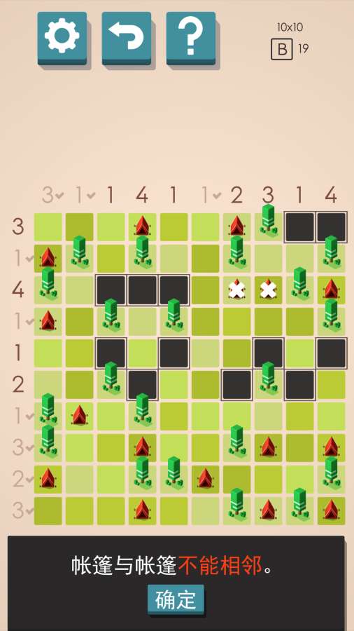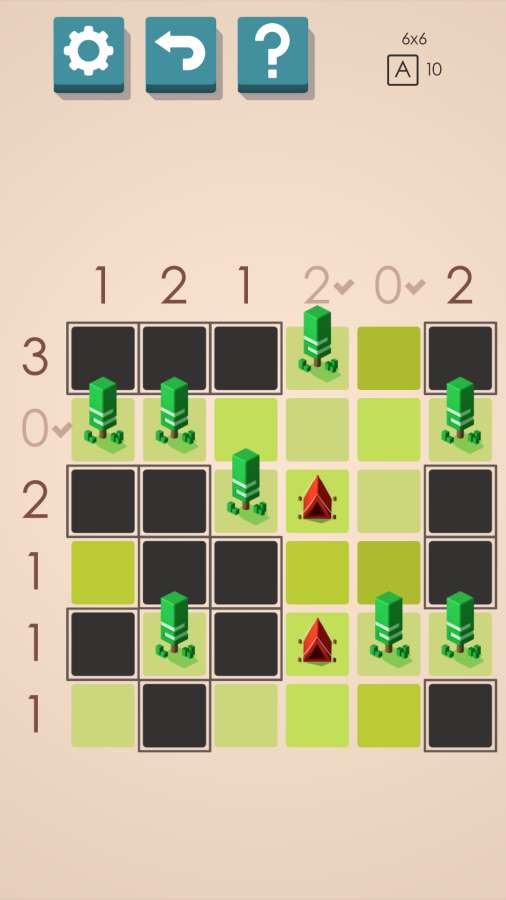 《帐篷与树 Tents & Trees》是一款颇具吸引力的。每一关中都会呈现几颗树和若干空位,玩家需将这些空位填充为草地或帐篷。帐篷必须紧邻树木,并且每行每列的帐篷数量须与游戏所设定的相符。游戏画面简洁明了,却耐人寻味。