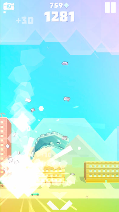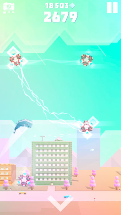 《巨大鲸》的玩法极为简单,可以视作一种另类的无尽跑酷。当前游戏地图仅有岛国和米国两大区域,并提供与越障两种挑战模式。玩家在游戏中可在高低起伏的楼顶间自由跳跃,凭借自身庞大的身躯,不断粉碎外星机器人。然而,这头巨鲸只能在屋顶上欢腾,一旦跌落地面便难以再起,毕竟你的身躯如此沉重。
