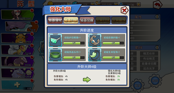 装备:当身上四件装备的阶级达到或超过1级后,同样根据最低阶级的装备获得属性加成。