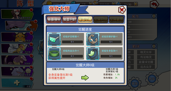 装备觉醒:当身上四件装备的觉醒等级达到或超过1级后,将根据最低觉醒等级的装备给予属性加成。