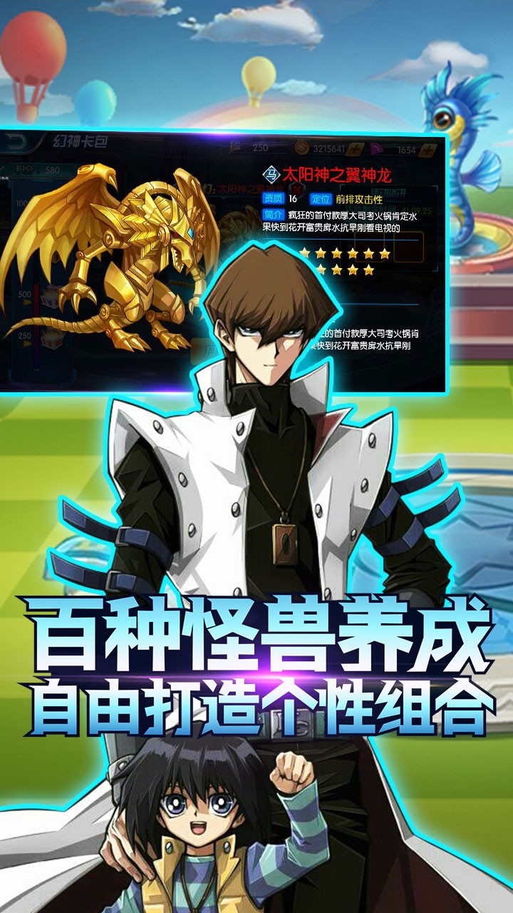 以超人气动漫“游戏王”为背景,原作与经典卡牌玩法,忠实呈现给您!青眼白龙、黑魔导、真红眼黑龙等怪兽恭候您的收集,激活千年积木,勇敢迎接挑战与冒险!最终的胜利将只属于一人。