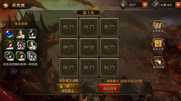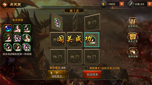 3.每通过1关,下关将增加1个魔王,玩家可使用元宝清除魔王,提高通关成功的概率;