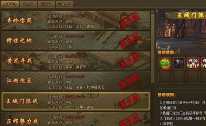 1.每日19:00至19:40开放王城门派战,正邪玩家的门派将分开对战,决出各自势力的最强门派。