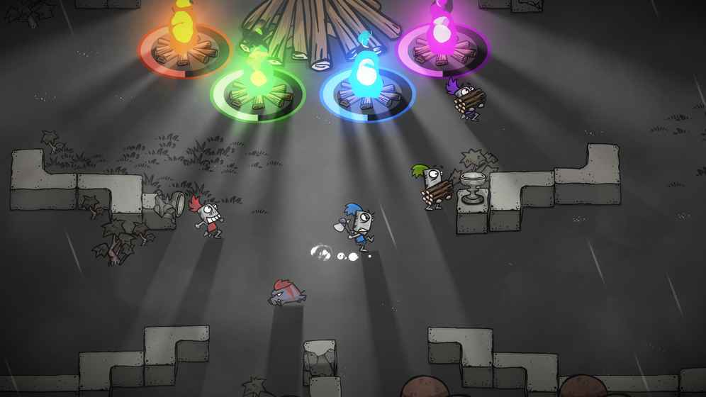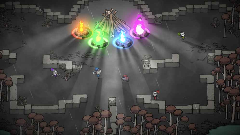 玩家将化身为参加篝火节狂欢的土著勇士,在战场上保护与自己颜色相同的篝火,通过砍伐植物获取木材,以延续篝火的生命。同时,玩家们也可以踢倒正在搬运木材的对手,争夺资源,或是前往湖边取水,迅速浇灭他人篝火,以此来增强自身的优势。