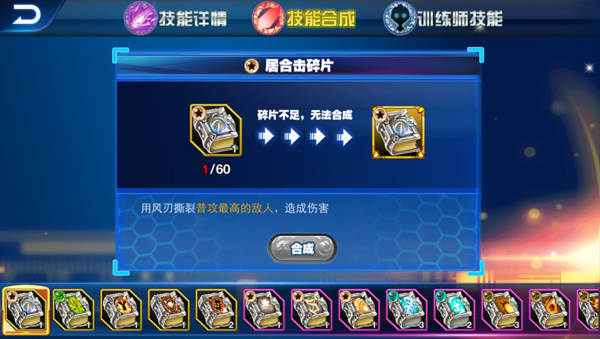 技能书的合成过程相对,与精灵合成类似,只需在碎片充足的情况下点击下方的合成按钮: