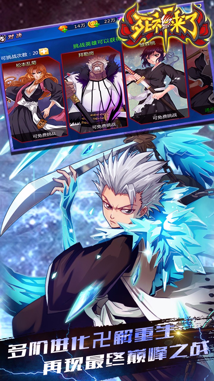 《死神来了》是一款根据人气漫画《死神》改编而成的3D手游,玩家可自由搭配,构建属于自己的死神军团。除此之外,游戏中华丽炫酷的战斗场景更是不可或缺,运用3D特效精心打造出逼真的战斗体验,快来下载体验吧。