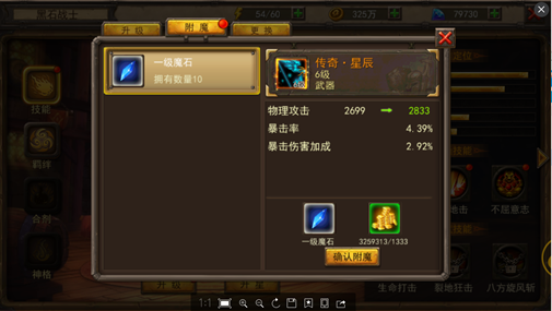 2、附魔需要消耗一颗魔石及金币,魔石最高为12级,五颗低级魔石可为更高级魔石。附魔等级越高,所需金币也越多。