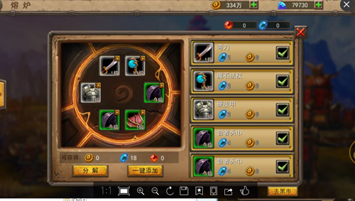 玩家可将多余的装备通过熔炉进行熔炼,熔炼后将返还升级时所消耗的全部金币,并获得装备水晶(黑市购买装备所需的资源之一)。装备品质越高,返还的水晶越多,红色品质装备则仅返还装备精华(兑换红色装备的资源)。