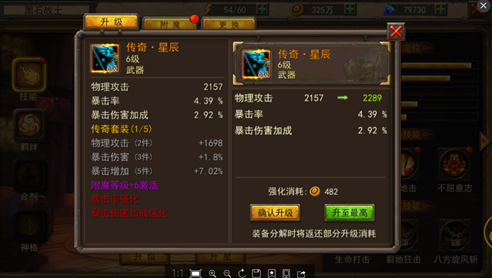 1、装备升级需消耗金币,等级越高,所需金币越多,属性提升也随之增加。