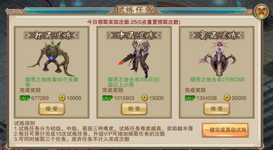 试炼任务分为初、中、高级三个难度,难度越高,奖励愈为丰厚,每日可累计完成15次。