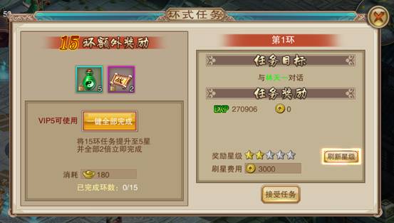 小技巧:环式任务的奖励与星级挂钩,若遇低星级奖励,建议刷新至高星级,这样经验值将成倍增加!