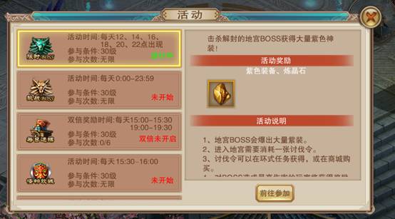 参与活动不仅能获得大量经验,还有神秘装备与丰厚奖励,绝不可错过!切记留意活动时间哦!
