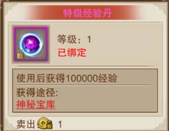 使用经验丹可获得丰厚经验值,神秘宝库中有机会获取。