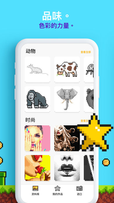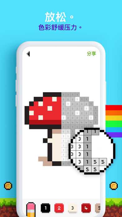 逃离生活的压力,完成一系列独特的减压图画。与家人或朋友共同释放压力,这既有趣又简单,您无需精通美术!只需依照像素框内的数字进行上色。底部的特殊调色盘将建议每个数字对应的颜色。