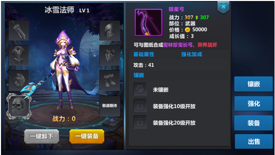 装备是战力的主要组成部分,一身极品装备是所有玩家不懈追求的目标。装备的品质分为绿、蓝、紫、红、金五种,各部位包括武器、头盔、衣服、项链、戒指、长靴和神器。装备可进行强化或出售,也可镶嵌强大的宝石,玩家还可进行套装,合成套装还会获得额外属性加成哦!