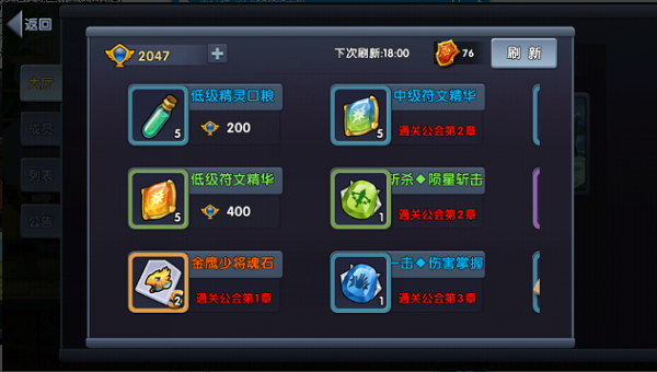 3. 公会商店:商店内可购买公会独有的道具,需通过公会副本通关解锁高级道具;