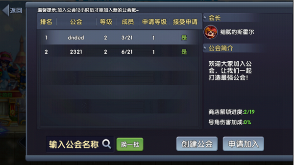 1. 加入公会:选择一个公会,点击申请加入,即可发起申请,若满足公会设置条件,便可立即加入;