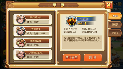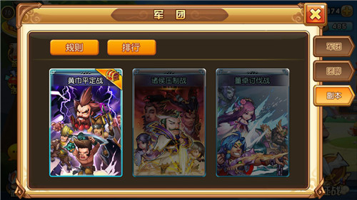 在《突袭三国志》中,完成一定进度的副本即可解锁军团系统,玩家可自主创建军团或加入他人所建军团。军团整体玩法以为主,结合PVE多副本模式,既能让玩家体验激情澎湃的战斗与互动,更能获得丰厚的战利品与特殊道具。