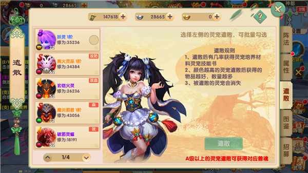 灵宠遣散能够与已经招募到的灵宠接触契约,让其从灵宠列表里消失。遣散灵宠后能够有几率获得灵宠培养材料以及灵宠技能书。品级越高的灵宠遣散后获得物品越好,数量越多。