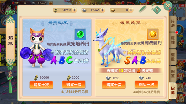 灵宠招募可通过两种招募方式,其一是通过帮贡进行招募,能够有几率获得A、B、C三个品级的灵兽。其二是通过银元进行招募,能够有几率获得全部品级的灵宠。招募也能够获得灵宠培养材料以及灵宠技能书。