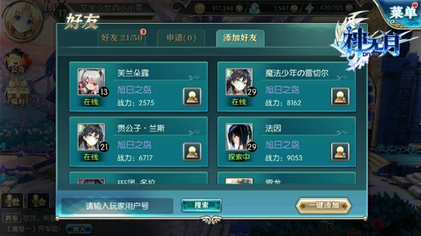 在游戏中独自一人,仿佛是之旅,而体验网游的真正乐趣,便在于与好友的互动。《灼眼的夏娜》添加好友的过程相当简单,达到一定等级后,丽娅丝小姐姐将自动提醒你可以进行好友添加。在游戏初期,添加好友时可以毫不犹豫地全选,玩家们只需轻松一键添加,或者通过搜索好友名称实现特定添加。主线任务中还有添加好友数量的要求,因此多结交些朋友也能助你达成成就哦。