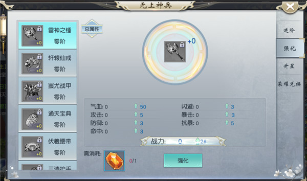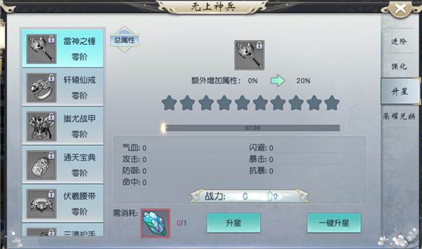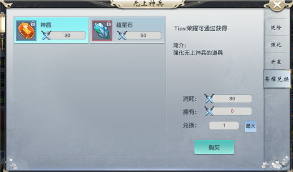 强化和升星所需道具【神晶】、【蕴星石】可进行兑换。