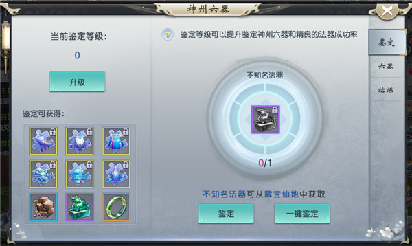 鉴定【不知名法器】有机率获得神州六器碎片,用于神州六器,而【不知名法器】主要来源于藏宝仙地。