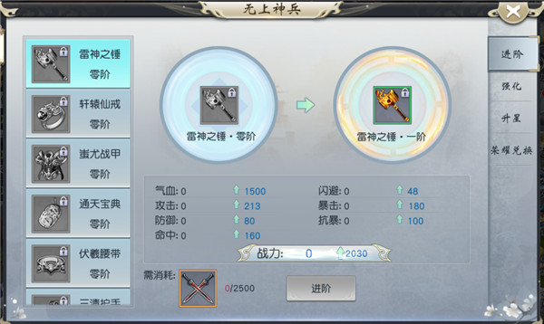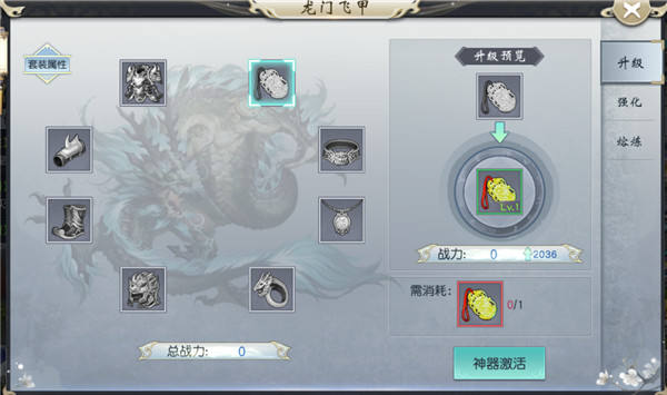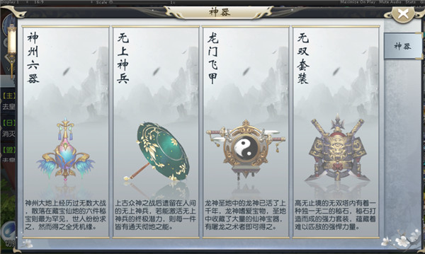 神器系统分为四大项,分别为神州六器、无上神兵、龙门飞甲、无双套装。