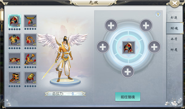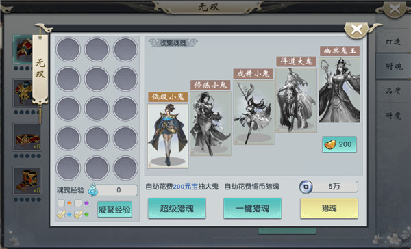 通过消耗元宝或铜币进行猎魂,获得魂魄后进行附魂,增加属性。