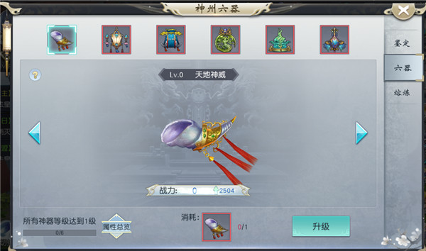 神州六器共分六个种类,全部激活可获得额外套装属性,神器亦可增强战力。