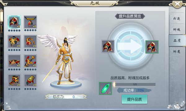 消耗灵石提升无双装备品质,品质由低到高依次为:白、绿、蓝、紫、橙、红。