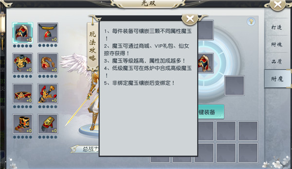 无双装备可通过附魔镶嵌魔玉,魔玉可通过商城、仙女掠夺等途径获得。
