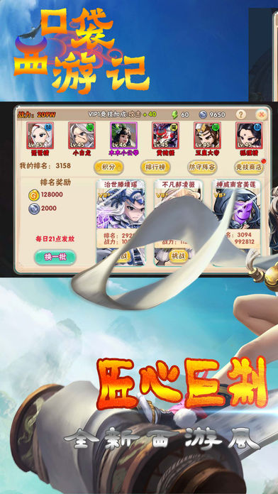 《口袋西游记》摒弃了繁琐乏味的手动刷怪玩法,致力于为广大玩家带来轻松的升级体验,即便离开游戏,依然为你勤奋打怪、刷装备!操作简便,重在策略,各式有趣的玩法应有尽有!收集西游神将,选择培养方向,学习技能,助你一路降妖除魔。竞技对决、帮派激战、跨服争霸、极限挑战,精彩纷呈!闲暇时光,还可采集宝石,钓鱼嬉戏,丰富玩法等你探索!