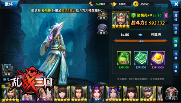 在《乱战三国》中,玩家可以通过使用经验道具来对武将进行升级,提升武将的战斗力。武将的最高等级将等于当日团队的等级。