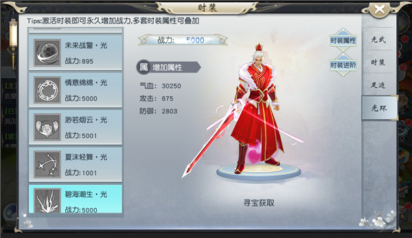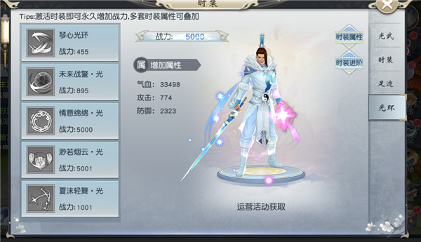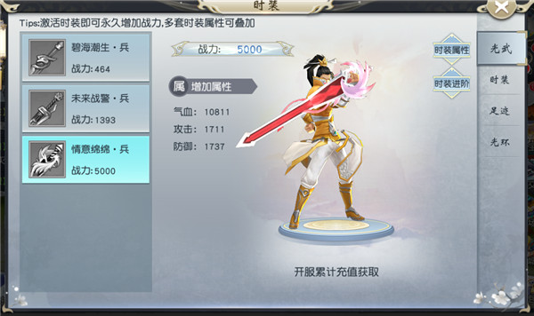 一、时装由四大部位构成:武器、衣服、足迹、光环。