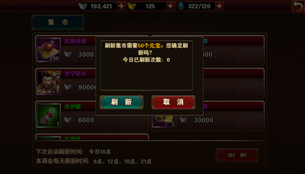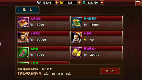 集市内可购得的物品琳琅满目,例如:武将经验丹、战将招募符、武将碎片、武将装备以及被动技能书等。在众多物品中,武将碎片与被动技能书尤为珍贵,前期则更需武将经验丹及装备,玩家可根据自身需求适量购买。