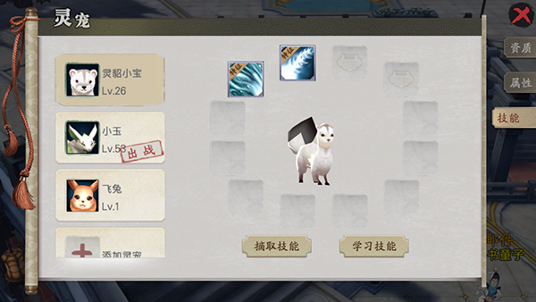 剑侠还可通过技能摘取功能,摘取灵宠已掌握的技能,摘取时需消耗对应技能品质的空白技能书。摘取完成后的技能数可用于其他灵宠学习该技能。