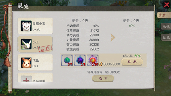 若对灵宠的属性不尽满意,剑侠可通过灵宠培养功能提升灵宠的资质,从而提升各项属性,培养强力伙伴的梦想不再遥不可及!