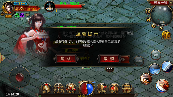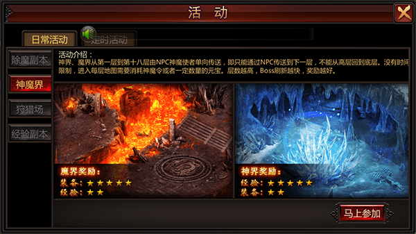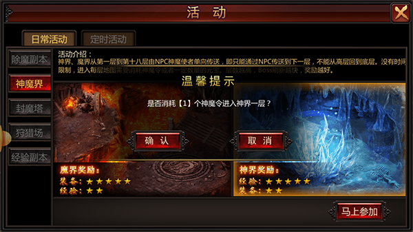除了【除魔副本】之外,另一个的好去处便是【界】。该界分别设有两个活动副本,供玩家进行“经验获取”和“装备获取”。神界与魔界各有九层,每层均设有NPC神魔使者单向传送,且没有时间限制。进入每层地图需消耗或一定数量的元宝,层数越高,BOSS刷新速度越快,奖励也愈加丰厚。